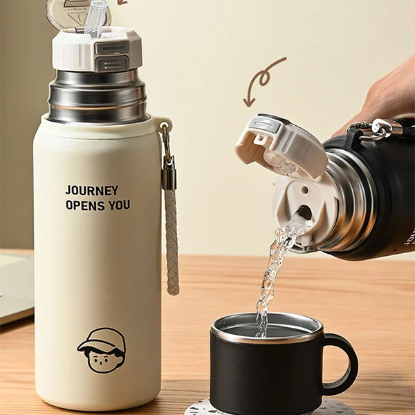 Parte di coperchio: coperchio PP Plus in acciaio inossidabile. La parte superiore del coperchio in acciaio inossidabile può essere utilizzata da sola come una piccola tazza. La sezione del coperchio sigillato è un coperchio a doppio consumo. È possibile premere un interruttore per aprirlo per bere diretta, consentendo all'acqua di entrare nella piccola tazza contemporaneamente. L'altro pulsante può aprire la sezione di paglia per bere acqua attraverso la cannuccia.