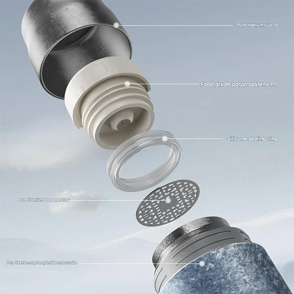 Classico produttore di tè, la bottiglia in titanio è dotata di una tazza a prova di perdite realizzata in puro titanio sia all'interno che all'esterno, dotata di coperchi a prova di perdite, tappi per tazze in titanio puro e antiscottatura a doppio strato!