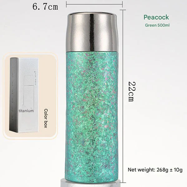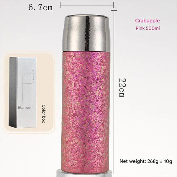 Le bottiglie d'acqua in titanio adottano un design di isolamento sottovuoto a doppio strato. È stato dimostrato che le nostre bottiglie d'acqua in metallo forniscono il miglior isolamento per le tue bevande, che si tratti di cola ghiacciata o caffè caldo. Le bevande calde possono essere mantenute calde fino a 8 ore, mentre le bevande fredde possono essere mantenute calde fino a 12 ore. (Dati sperimentali: Isolamento: aggiungere acqua a temperatura ambiente di 99°C e la temperatura supererà 60°C dopo 6 ore di isolamento; Refrigerazione: aggiungere acqua a temperatura ambiente di 0°C e la temperatura sarà inferiore a 5°C dopo 6 ore di isolamento.)